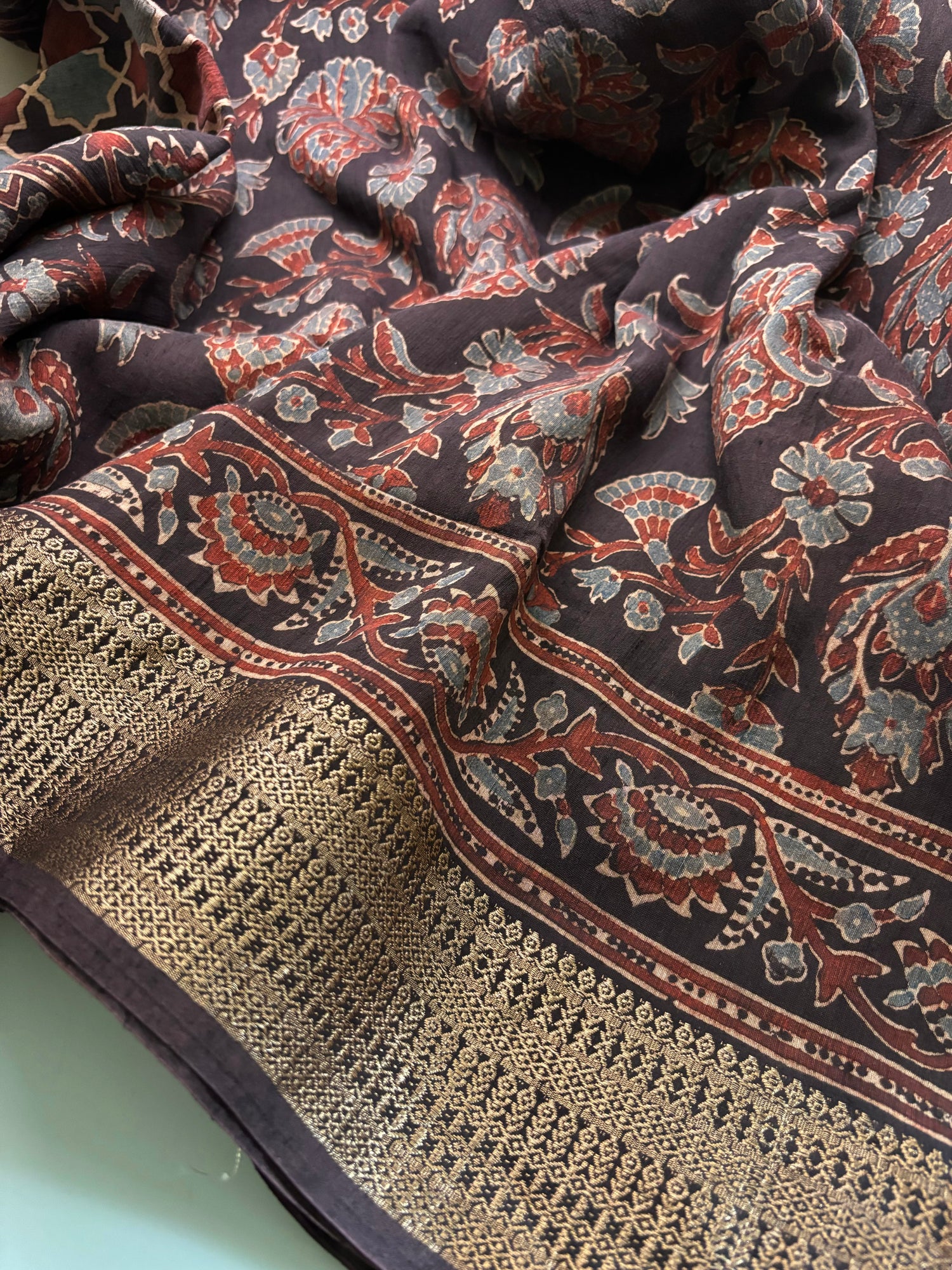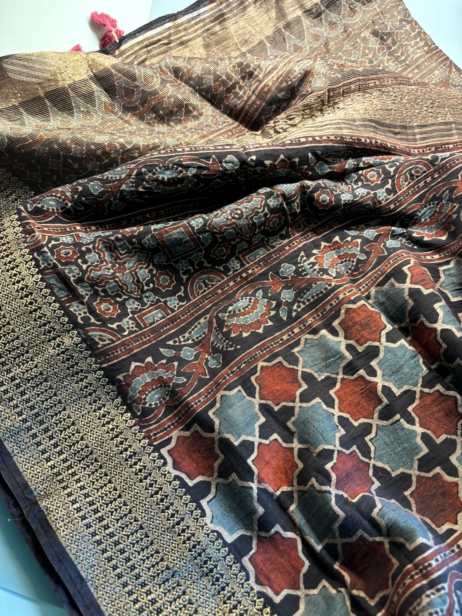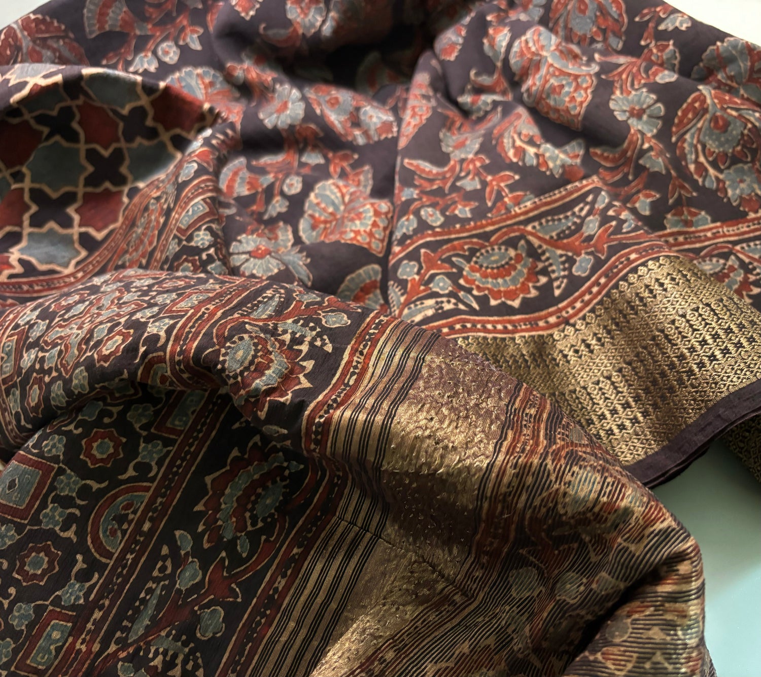 Ajrakh Hand Block Pure Cotton Saree with Zari Border