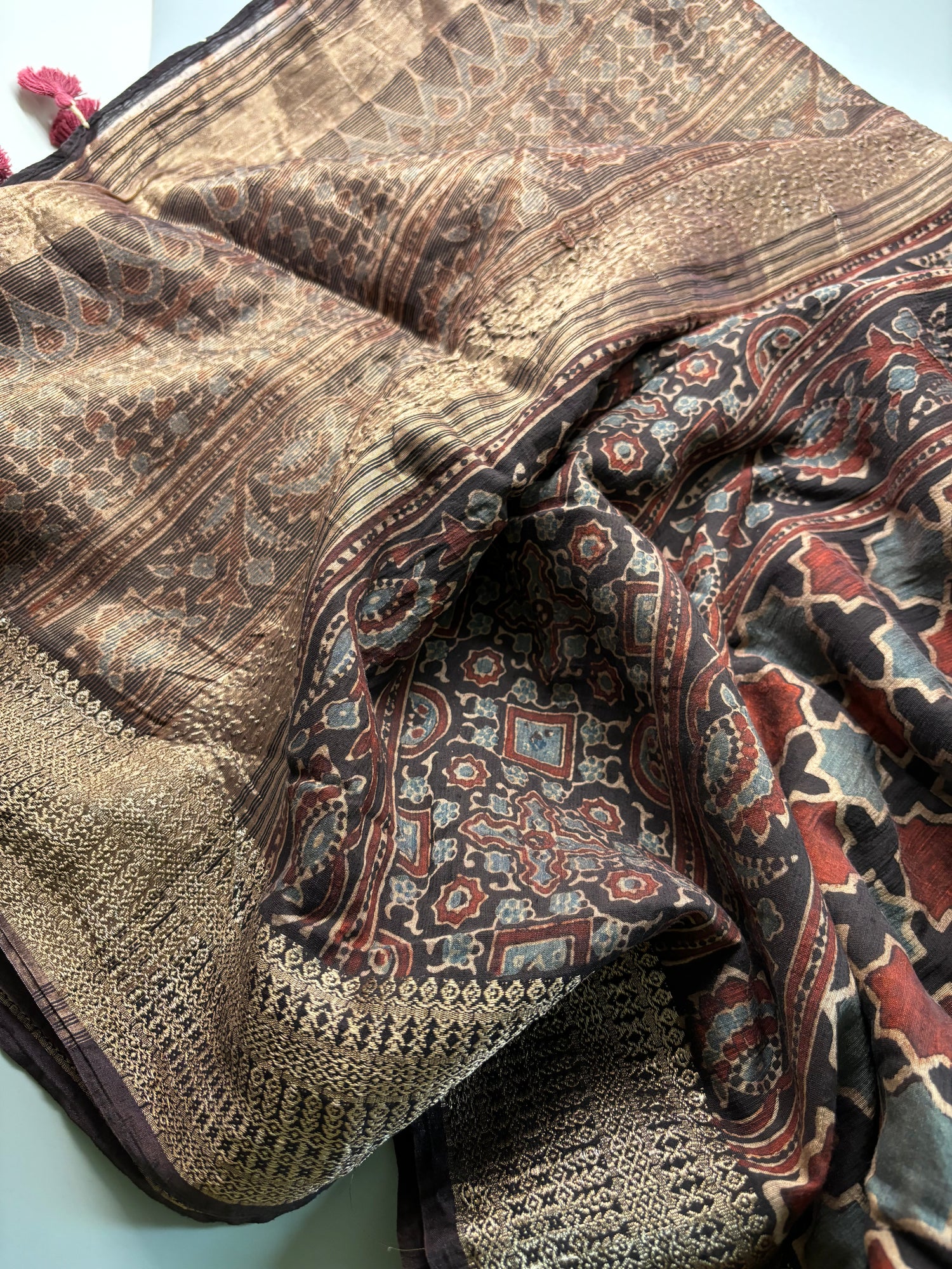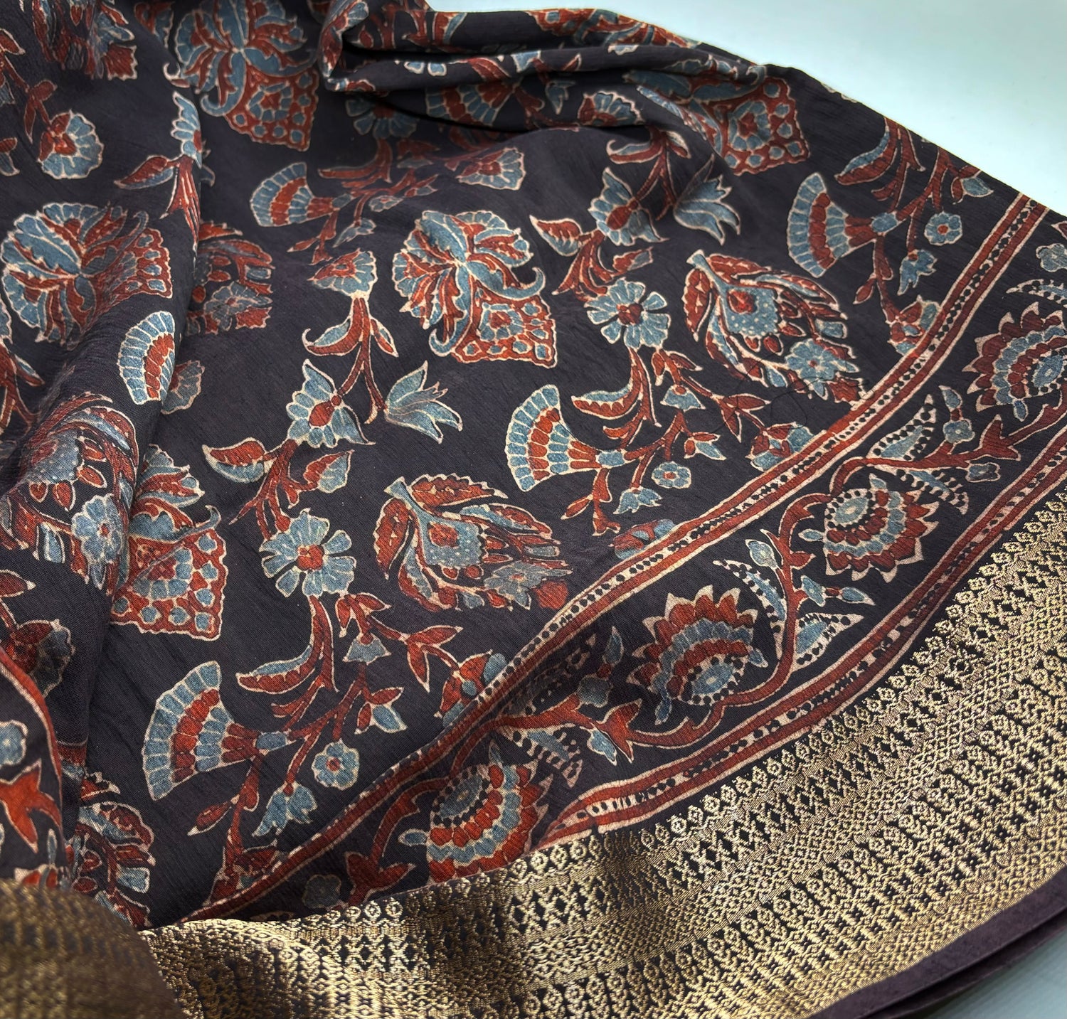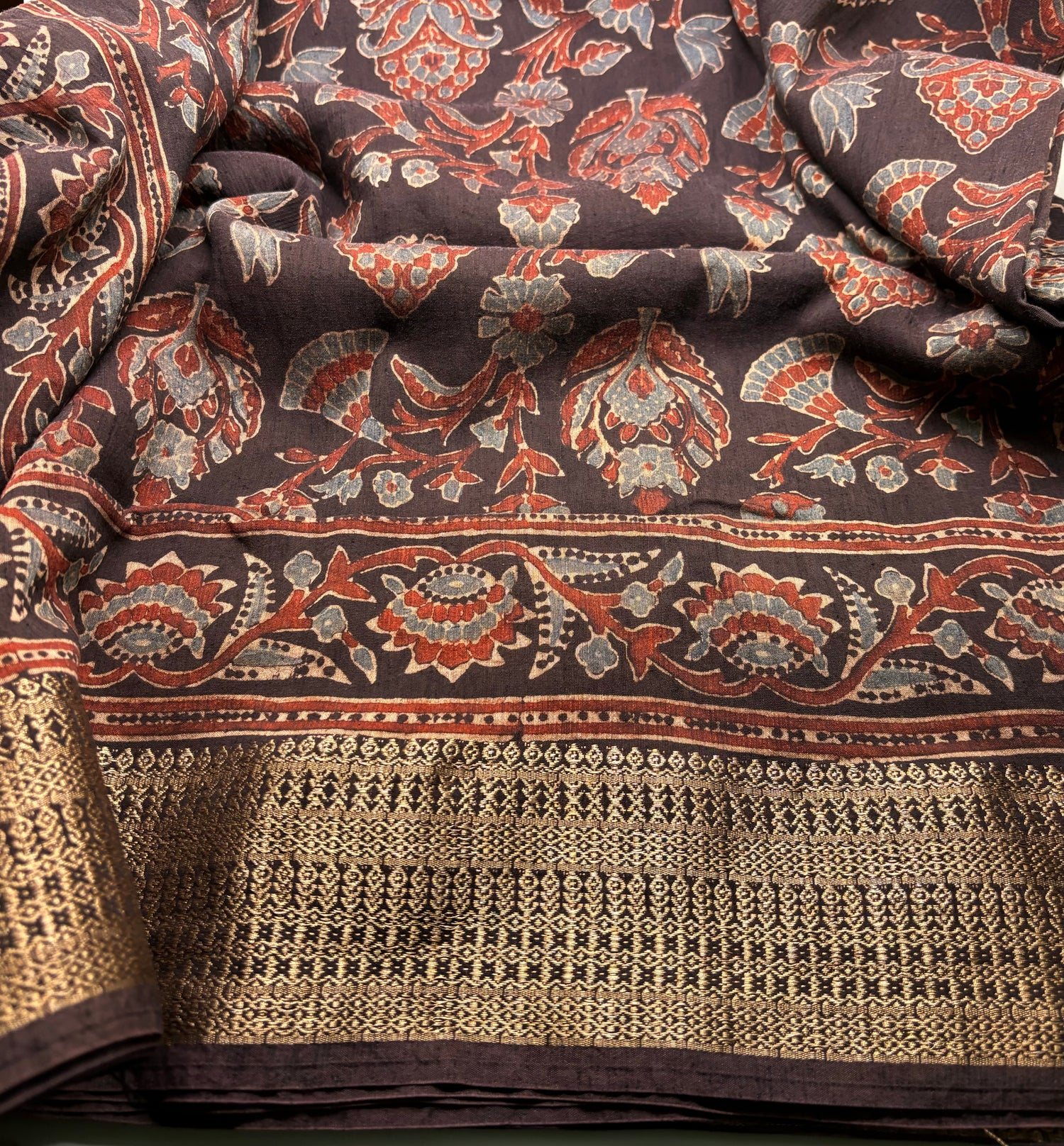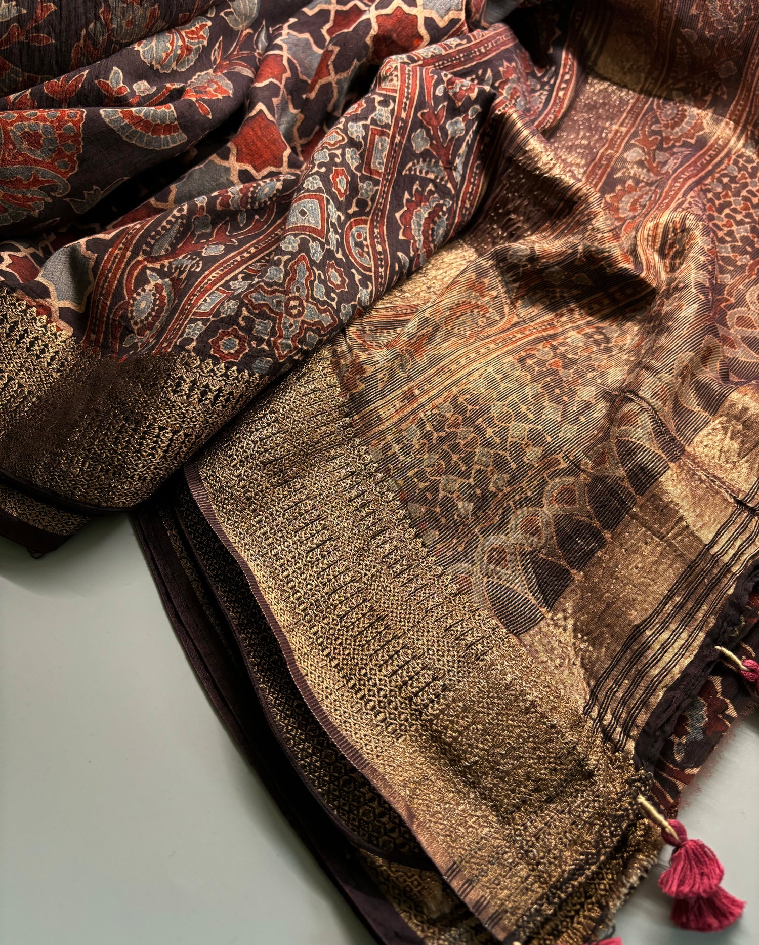 Ajrakh Hand Block Pure Cotton Saree with Zari Border