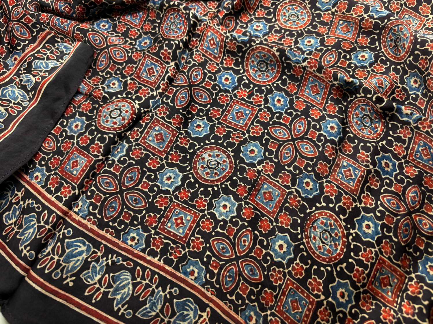 Ajrakh is a traditional style of block printing that has its roots in the Indian subcontinent, particularly in the regions of Gujarat and Rajasthan.
