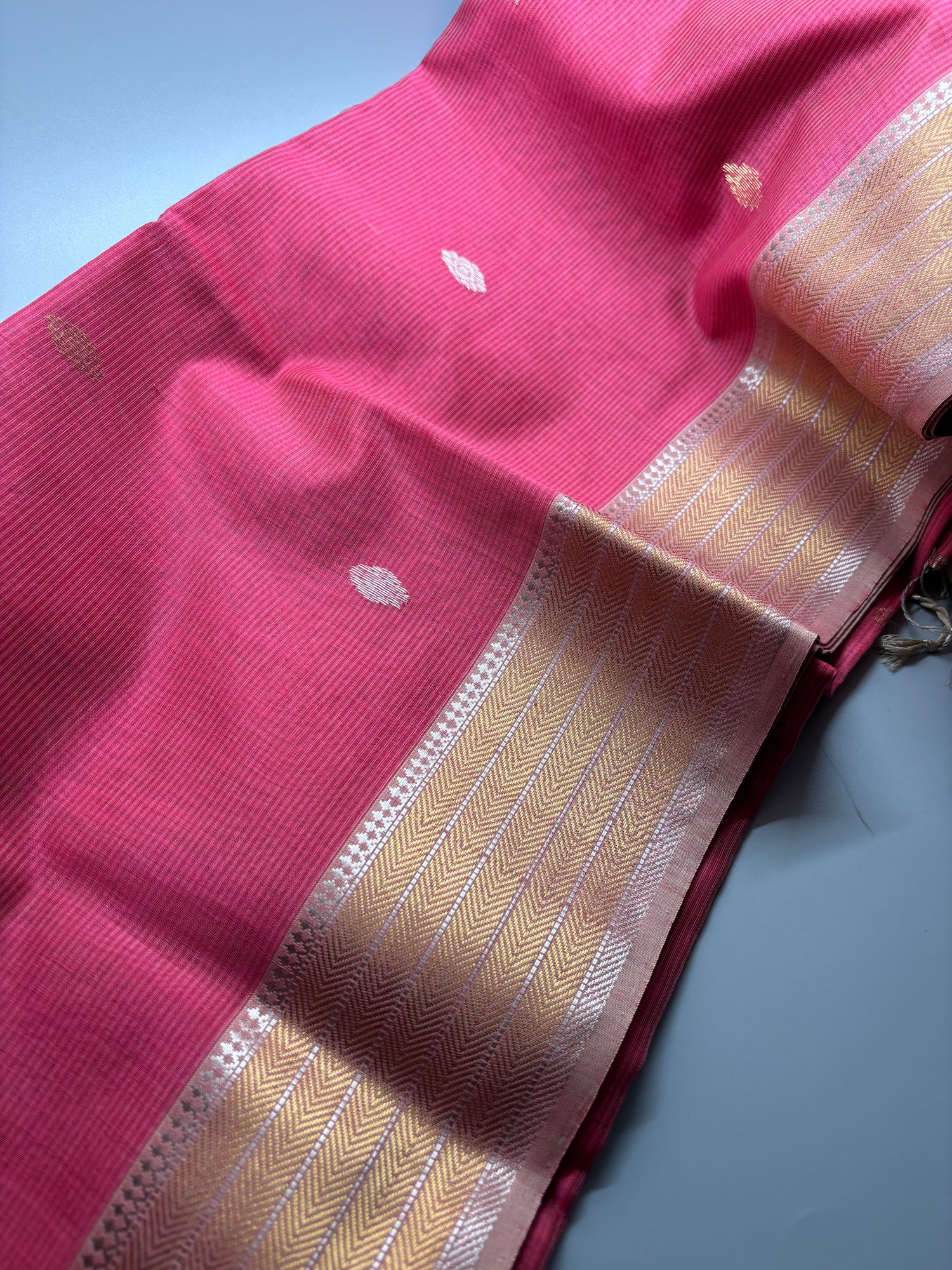- A fine blend of cotton and silk with beautiful rich zari and butta